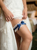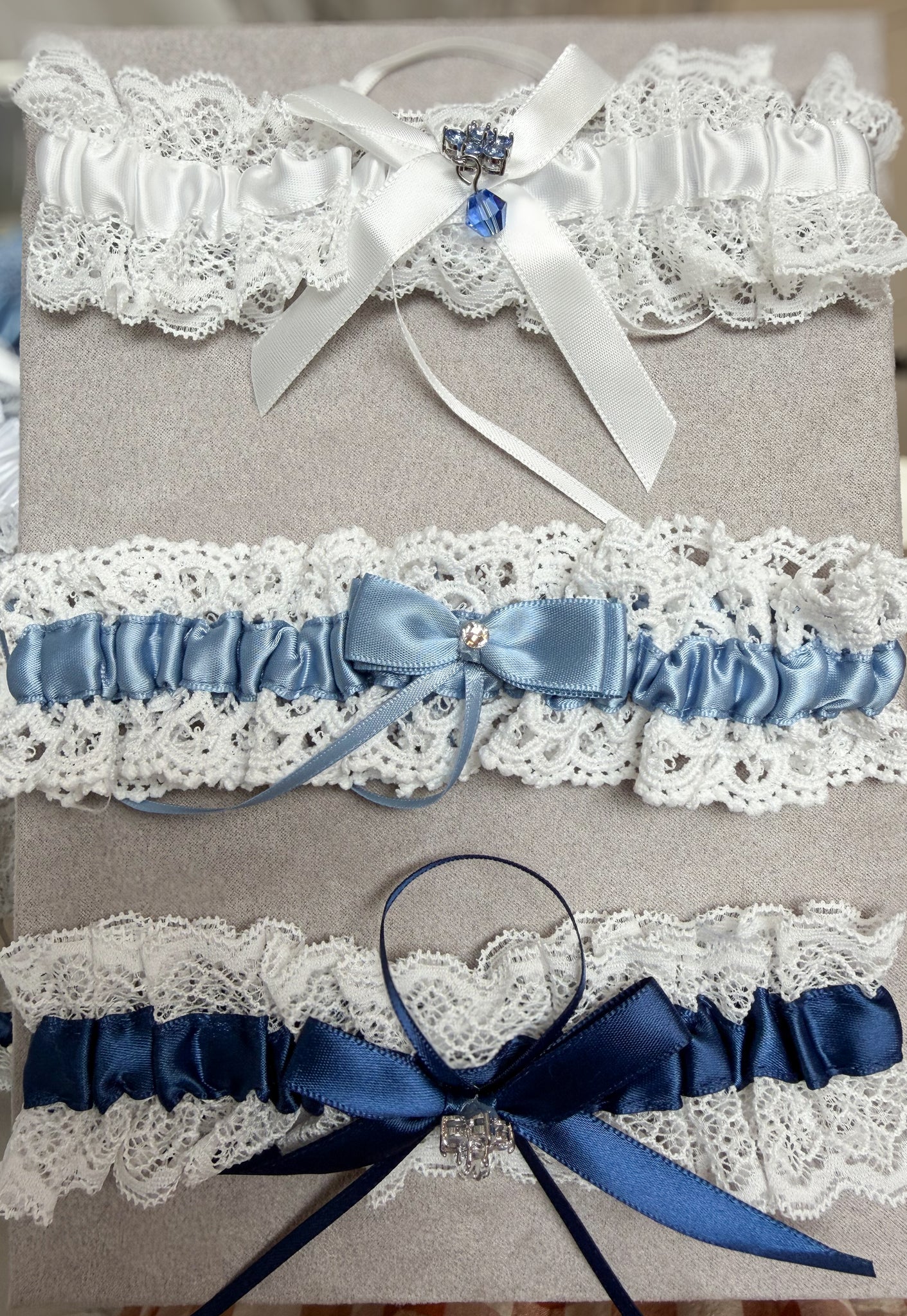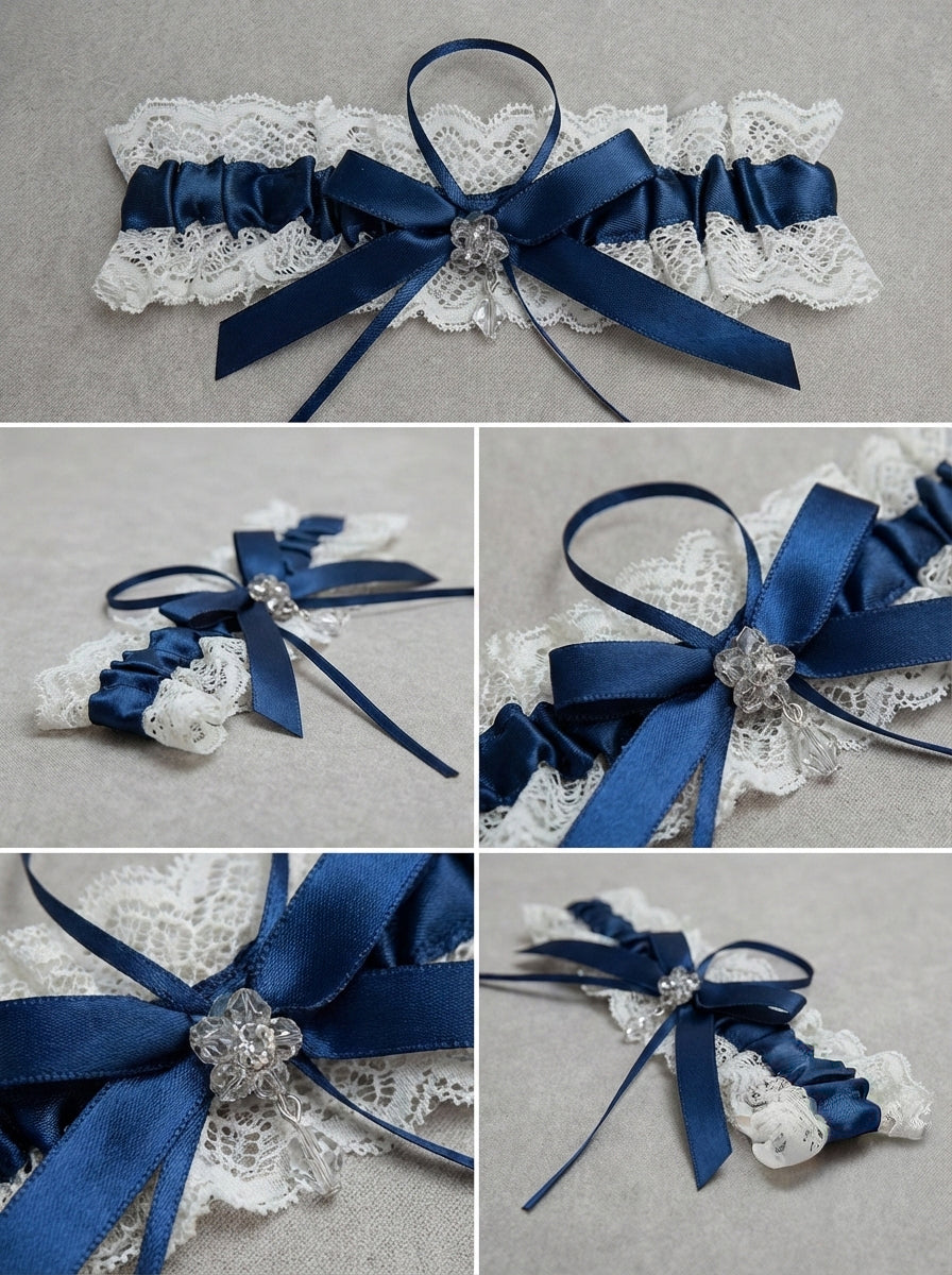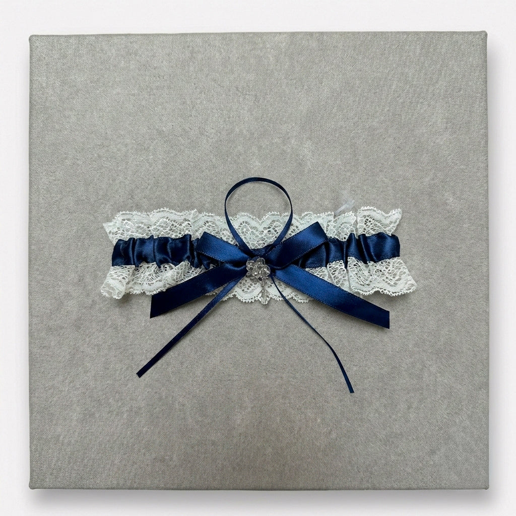 Liga elasticada con encaje, cinta de raso y detalle de flor.
